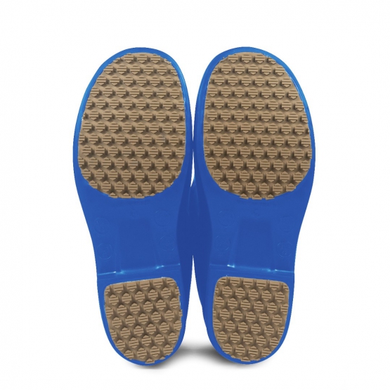 Bota ocupacional de EVA, modelagem unissex, equipada com solado de borracha hexagonal antiderrapante e palmilha antimicrobiana.